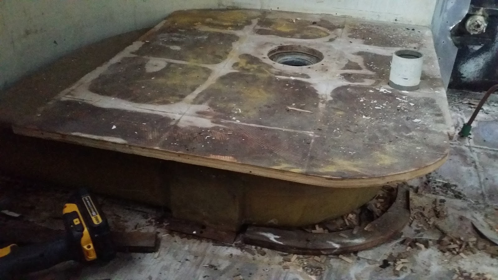 The Avion does have a black water tank, but since it sits mostly above the floor height, it won't work as a grey water tank. Once the water level filled up the few gallons BELOW floor height, it would start to back up into the shower. (Below: The toilet sits on top of the black water tank; toilet is removed for now but you can see several inches of the black water tank standing above the floor).